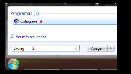 Inicio -> En "Buscar programas y archivos..." escribir dxdiag.exe . Aparecerá para ejecutar un programa. Hacerle clic.